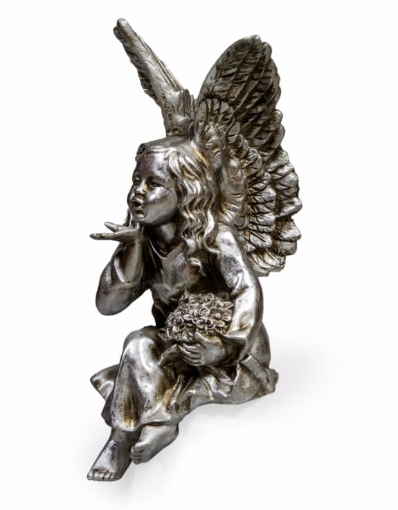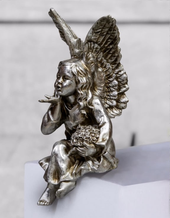 Whether she’ll be sitting on top of your bookshelf or watching over you by your bed, this delightful sitting angel is blowing you a kiss and wishing you luck with your day.